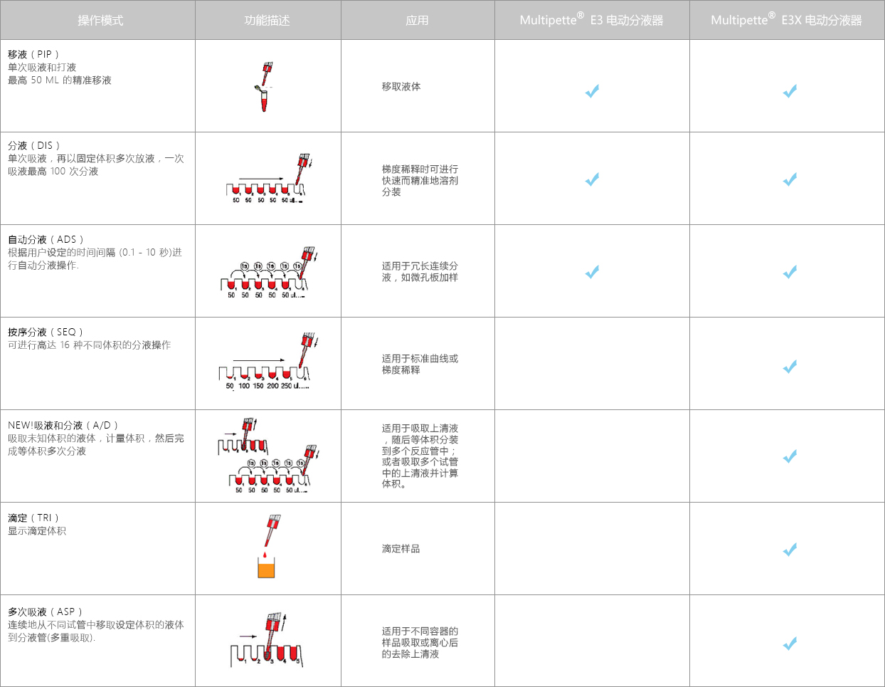 Multipette® E3/E3x 電動(dòng)分液器結(jié)合 9 種不同規(guī)格 Combitips advanced® 分液管,提供從 1 μL——50 mL 的分液范圍,超過 5000 種分液體積,一次吸液可完成最高 100 次分液