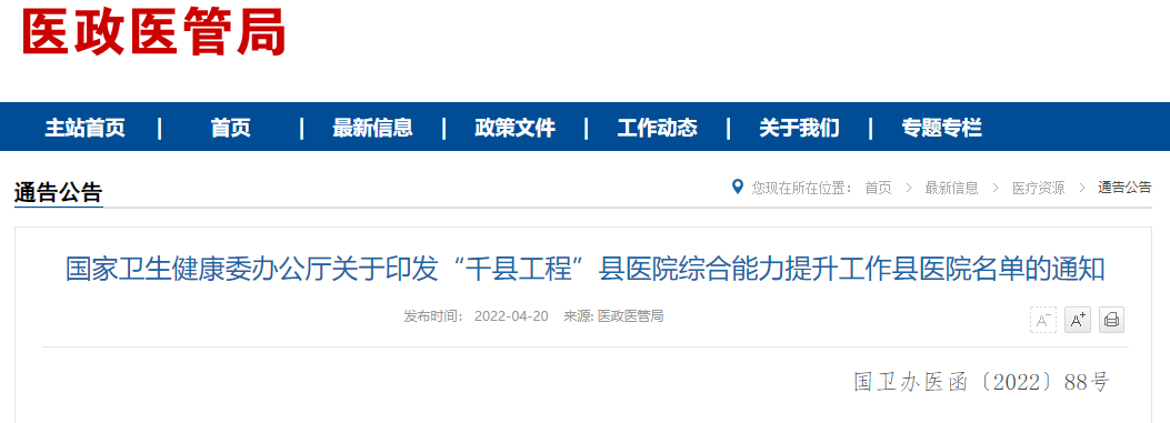 其旨在提高縣醫(yī)院綜合能力,滿足縣域居民基本醫(yī)療服務(wù)需求。未來根據(jù)各縣醫(yī)院醫(yī)療服務(wù)能力評估和工作推進(jìn)進(jìn)展,《名單》進(jìn)一步篩選和擴(kuò)充。(點(diǎn)擊文章左下角“閱讀原文”,查看完整《“千縣工程”醫(yī)院名單》。)