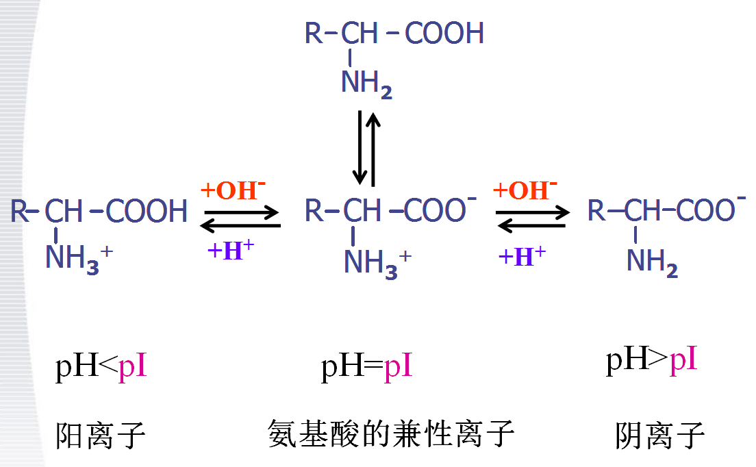 蛋白質(zhì)的等電點(diǎn)( isoelectric point, pI) 當(dāng)?shù)鞍踪|(zhì)溶液處于某一pH時(shí),蛋白質(zhì)解離成正、負(fù)離子的趨勢相等,即成為兼性離子,凈電荷為零,此時(shí)溶液的pH稱為蛋白質(zhì)的等電點(diǎn)。