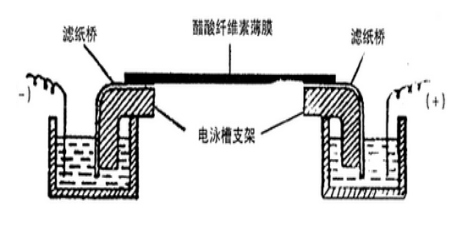 以醋酸纖維制成的薄膜作為支撐體的電泳稱為薄膜電泳。 醋酸纖維是纖維素的醋酸酯,由纖維素的羥基經(jīng)乙?;?。 將之溶于丙酮等有機(jī)溶劑中,即可涂布成均一細(xì)密的微孔薄膜, 厚度約以0.1-0.15mm為宜。 醋酸纖維素薄膜與濾紙相比較,有以下優(yōu)點(diǎn):