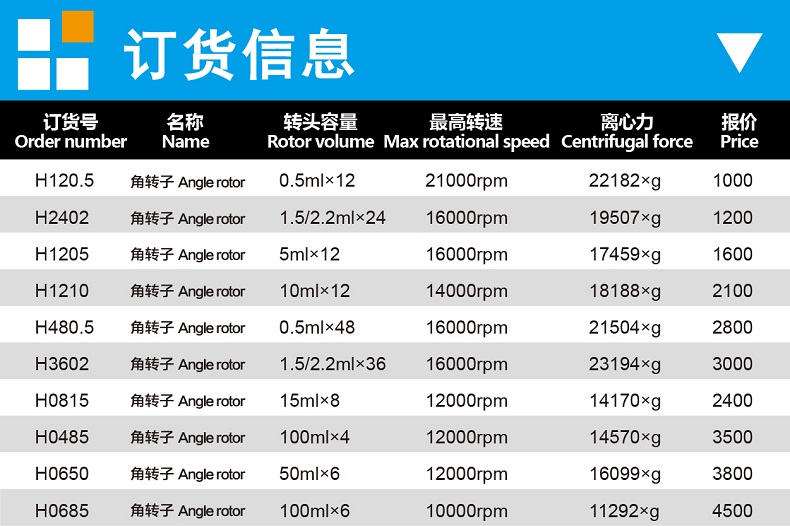 | H480.5 | 角轉(zhuǎn)子 | 0.5ml*48 | 16000rpm | 17465g |