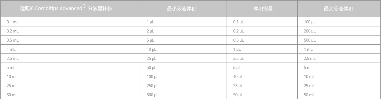分液器可分裝的體積由所選擇的分液管體積所決定,如下表