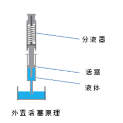 分液器結(jié)合分液管,采用外置活塞原理。分液管內(nèi)自帶有活塞,通過活塞的連接運(yùn)動(dòng)移取和打出液體(類似注射器)。
